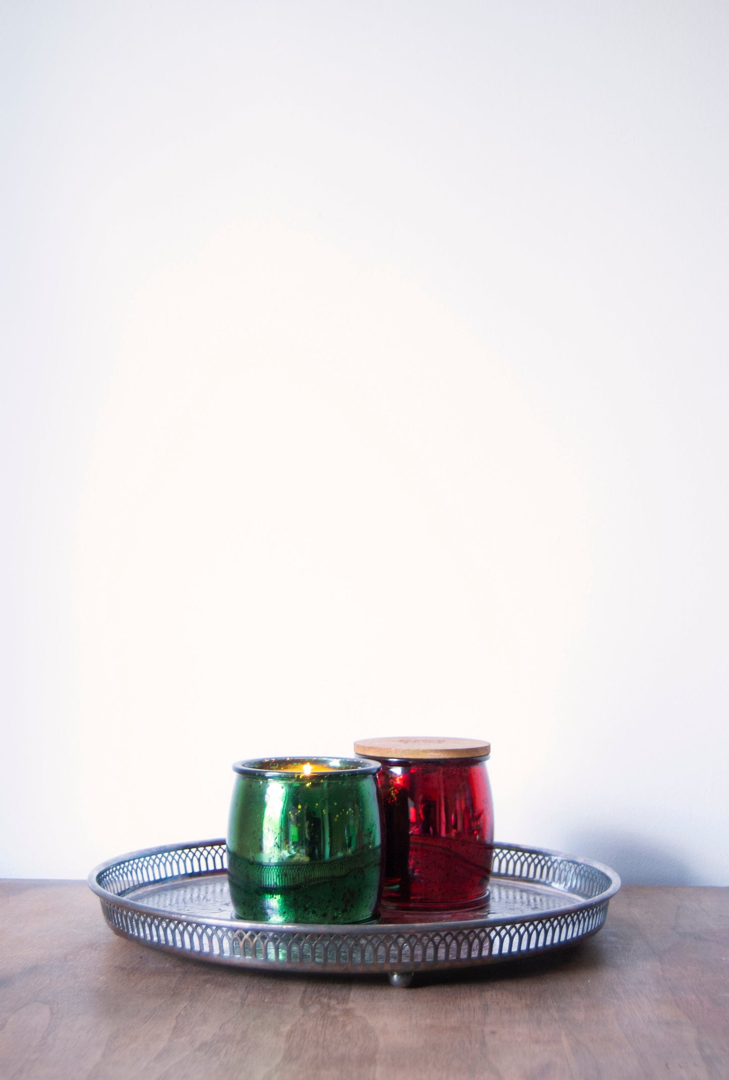 Hand poured, 17 oz soy blend candle, in a large Green mercury glass, topped with a wooden lid (4 x 4.25).
